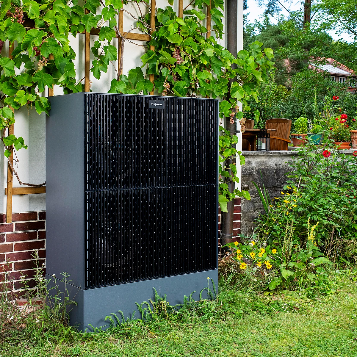 Die Außeneinheit wird außerhalb des Hauses aufgestellt und benötigt wenig Platz. Dadurch eignet sich diese Wärmepumpe ideal für Bestandsgebäude, aber auch für Neubauten.