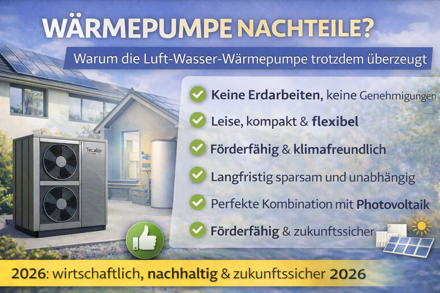 Wer 2026 eine neue Heizung plant, trifft mit einer Luft-Wasser-Wärmepumpe eine sichere Entscheidung. Sie verbindet moderne Technik mit niedrigen Kosten, hoher Effizienz und maximaler Zukunftssicherheit.