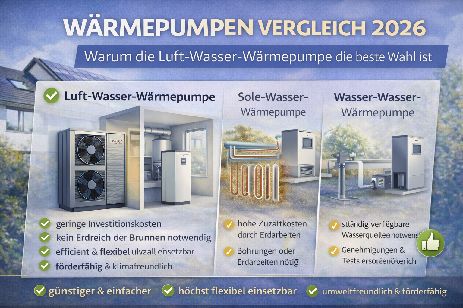 Wer 2026 eine Wärmepumpe kaufen möchte, trifft mit der Luft-Wasser-Wärmepumpe eine sichere und zukunftsfähige Wahl. Sie kombiniert moderate Anschaffungskosten, hohe Effizienz und flexible Einsatzmöglichkeiten – und bleibt damit die beliebteste Lösung dieses Jahres.